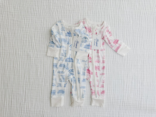 Classic cut organic cotton children's pajamas and buttery soft bamboo rompers for babies - all in our iconic Newporter print.