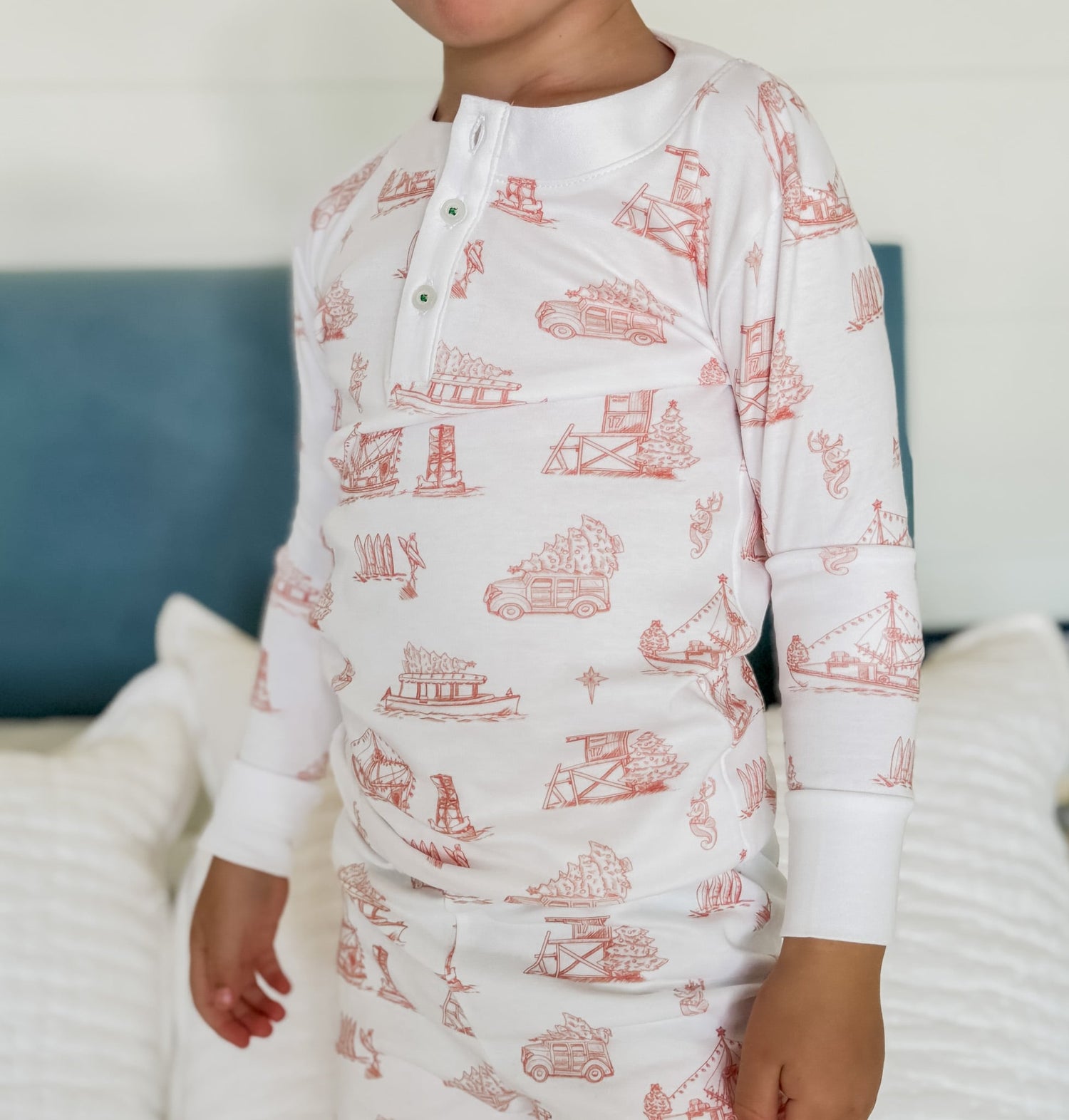 There is nothing quite like a California Christmas. This year, our Boat Parade Pajamas celebrate some of the festive things that make celebrating Christmas in California so very special. These 100% Pima cotton pjs feature our Christmas pattern in a 'Vintage Red' with green threaded pearl buttons (for sizes 2T+) and open footed zip rompers for smaller sizes.